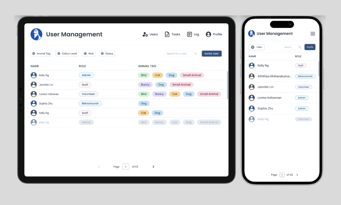 We designed an all-in-one web-app solution for both tablet and mobile devices on browsers! Our primary purpose is to help OMHS organize information. The app will enable volunteers to log in, view pets and tasks based on their skill level, record activities (e.g., walks or playtime), and track pet progress, improving efficiency and animal care. Through 12 months, I led the design of the user management, task management, the invite new user flow, as well as the creation of the design system.