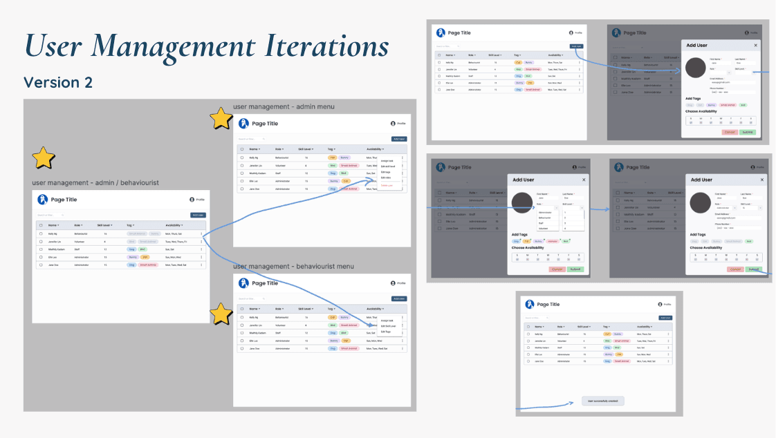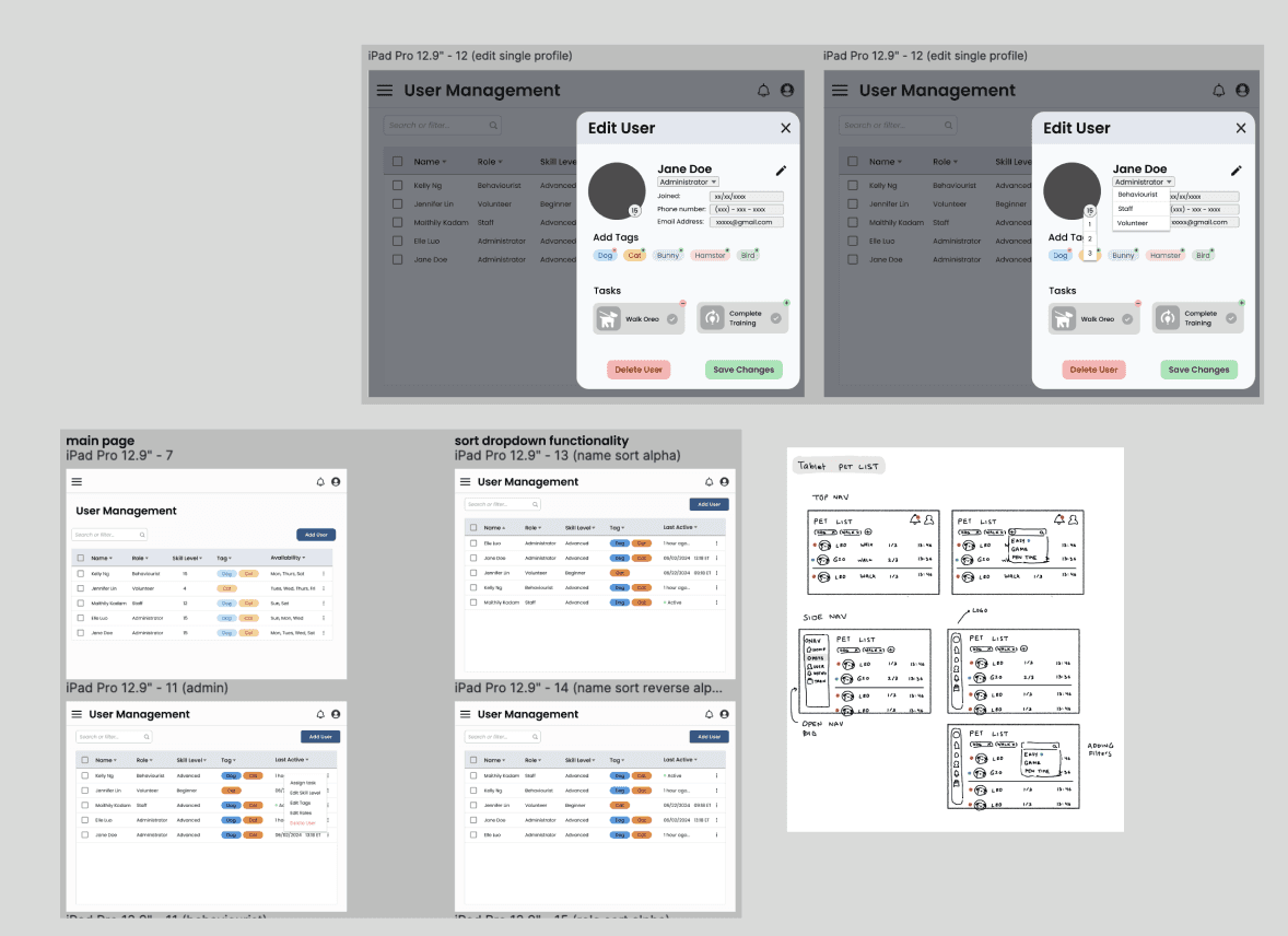 This also had us considering our 4 distinct users (Volunteers, Staff, Animal Behaviorists, and Admin) and time was taken to research and define each of these roles. A Permissions Spreadsheet was then created to determine their tasks and needs for the solution.