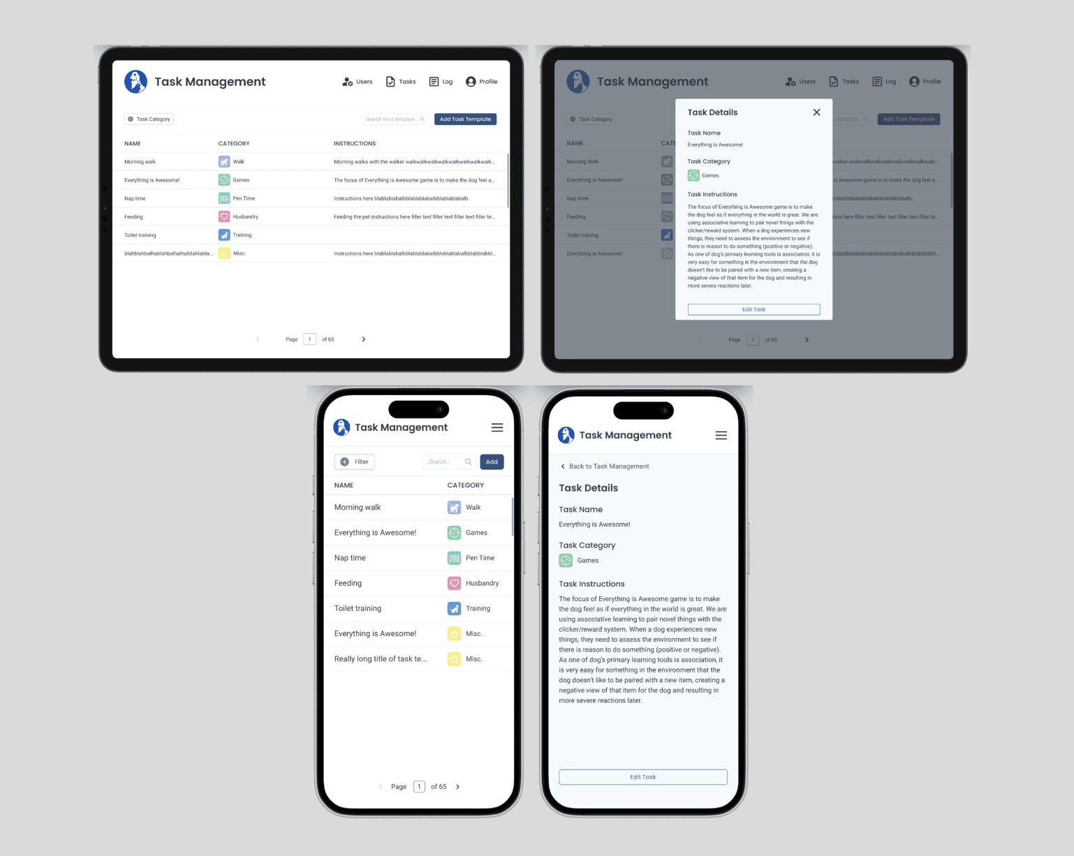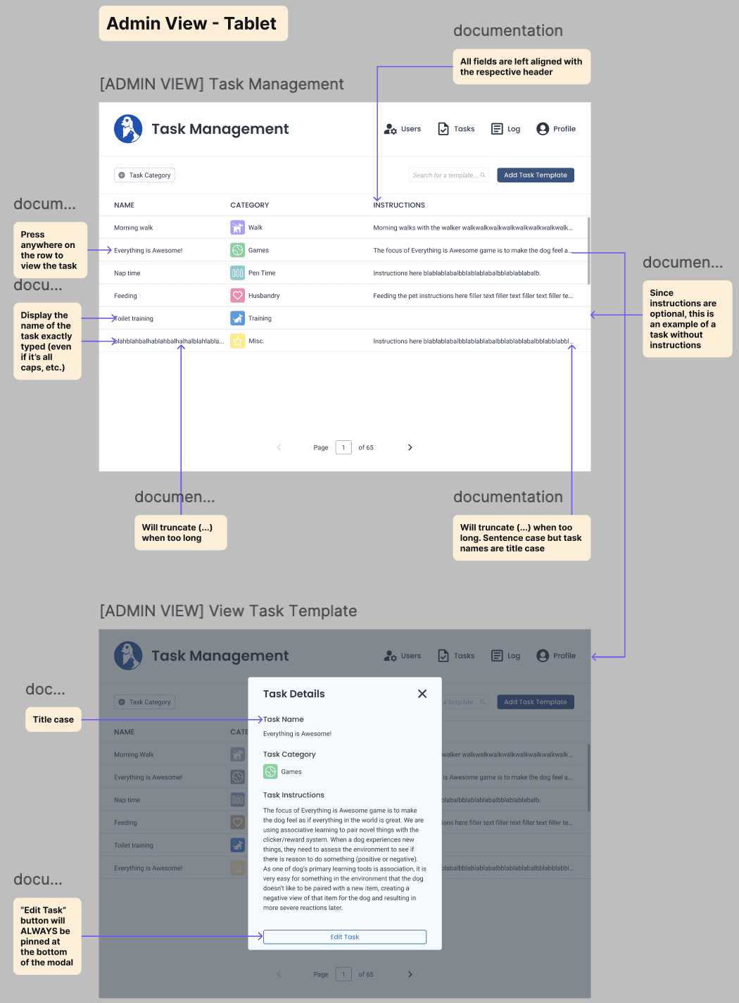From later discussions, the client wanted a way to manage task templates, so that people can easily assign tasks to each pet profile as an Admin! The feature we derived was similar to in design to the User Management Page, so that where I started!