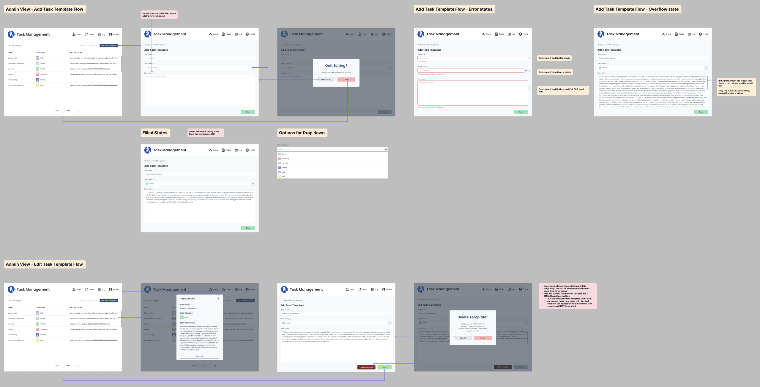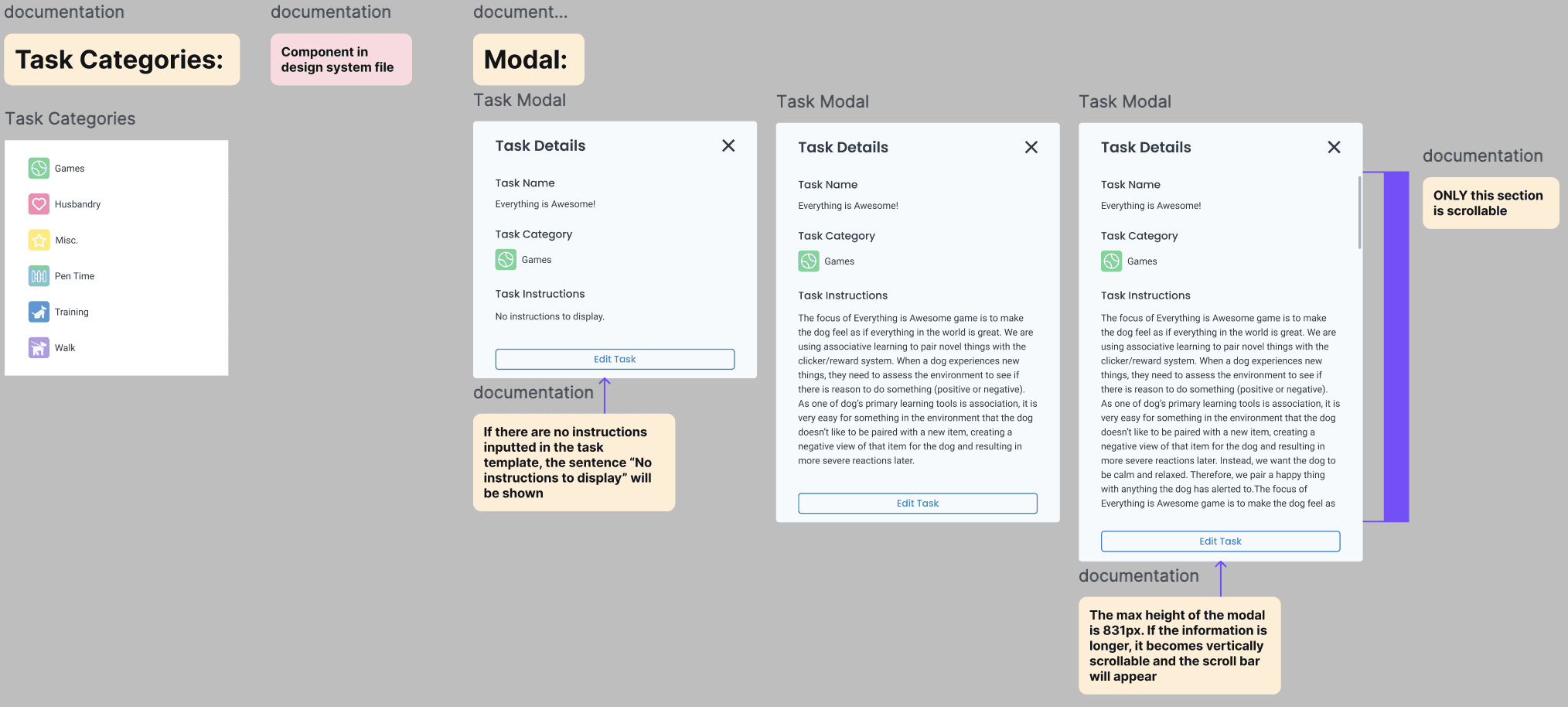 A new page called "Task Templates" would have to be designed, where they are universal templates that can be used to make a task for any pet. New modals and the different components that had to be used for this feature were designed and clearly shown.