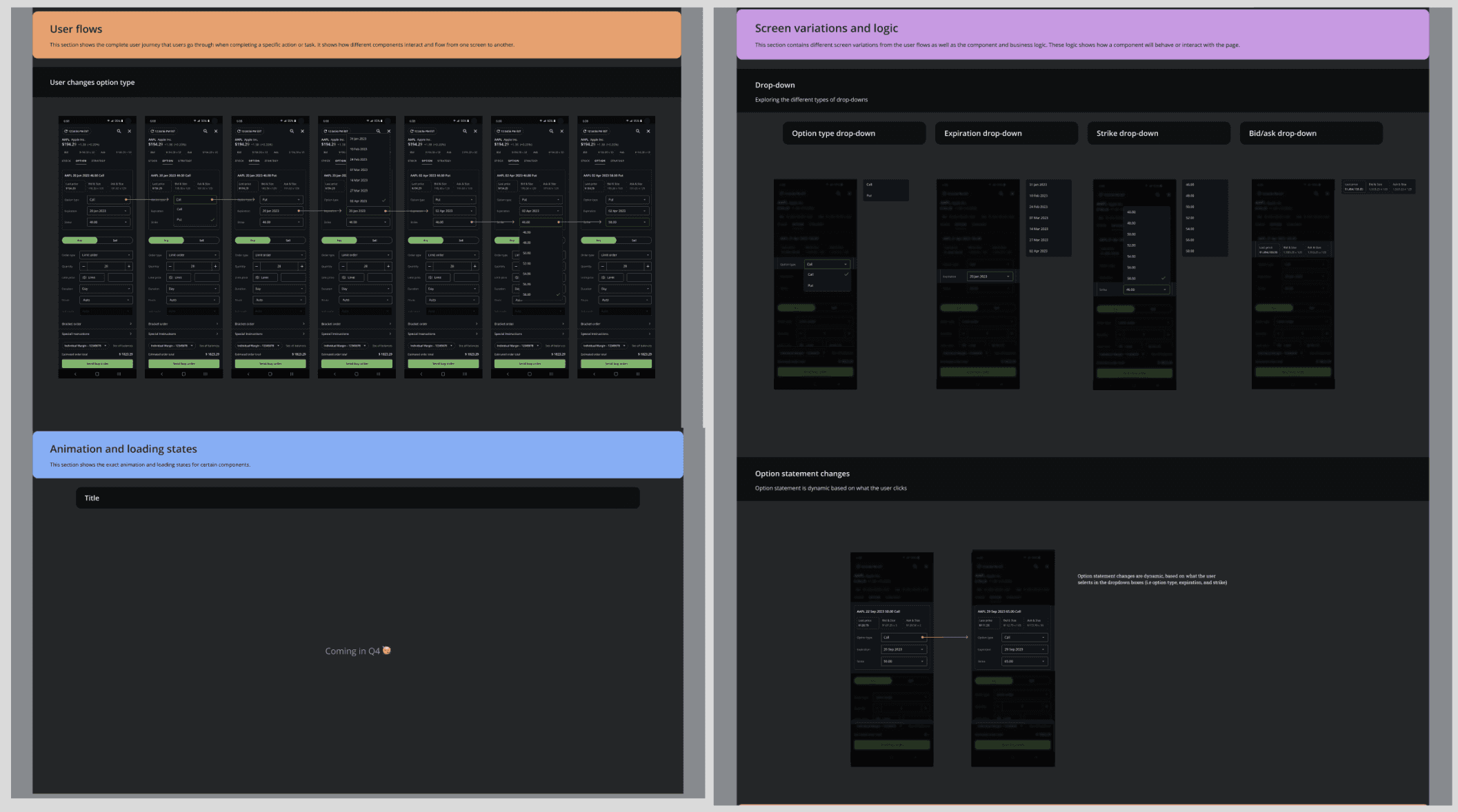 This section shows the starting point and the complete user journey that users go through when taking a specific action or task. It shows how different components interact and flow from one screen to another.Screen variations and logic