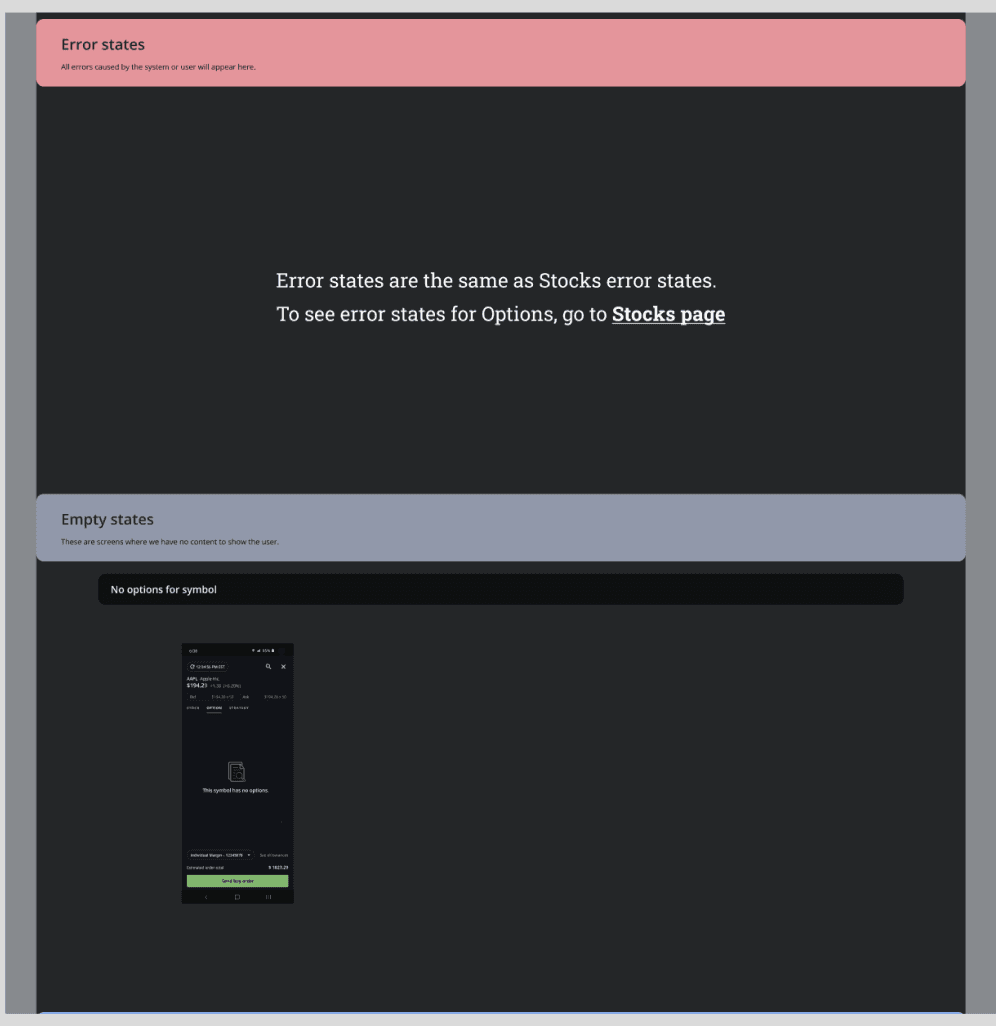 This section contains screen variations of certain pages from the user flows as well as component and business logic.Error states
