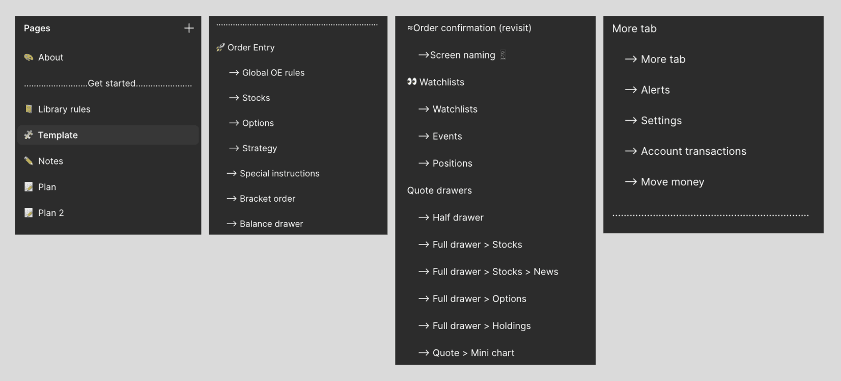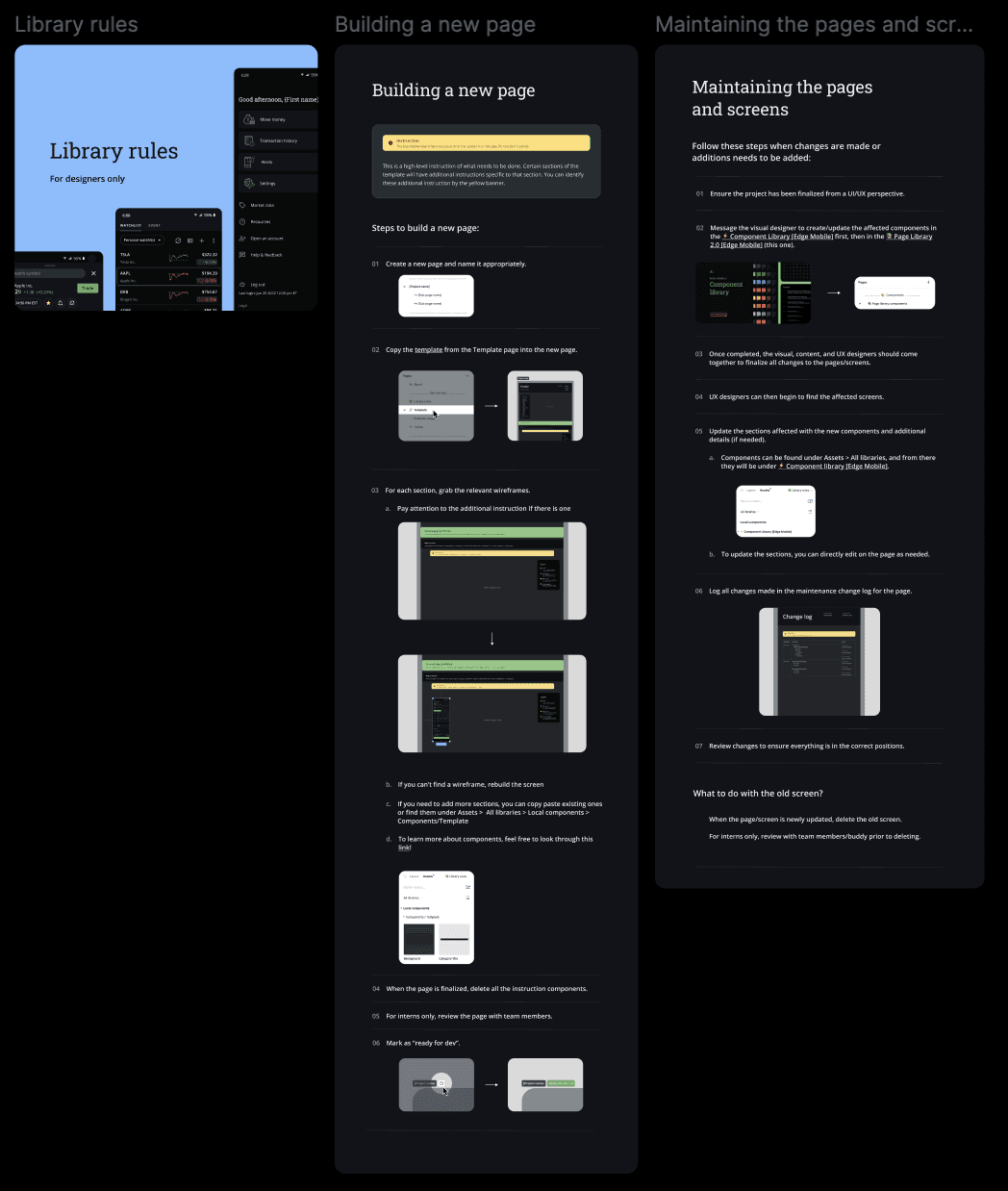 From there, I mapped out the different page types, screen states, and user paths that existed across Edge Mobile. This gave me a clearer sense of the full system and what the library needed to capture. I sorted the pages into clear categories, and created a page solely for walking through the template.